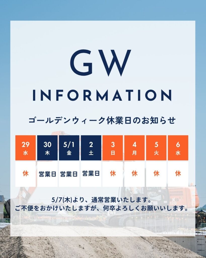 日頃より弊社をご愛顧いただきありがとうございます。弊社は、誠に勝手ながら下記の日程をゴールデンウィークの休業とさせていただきます。【ゴールデンウィークの休業期間】2026年4月29日(水)、2026年5月3日(日) ~ 5月6日(水)連休明けは、5月7日(木)より通常営業となります。休業期間中にいただいたお問い合わせについては、営業開始以降に順次回答させていただきます。皆様には大変ご不便をおかけいたしますが、何卒ご理解賜りますようお願い申し上げます。